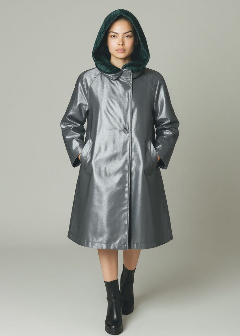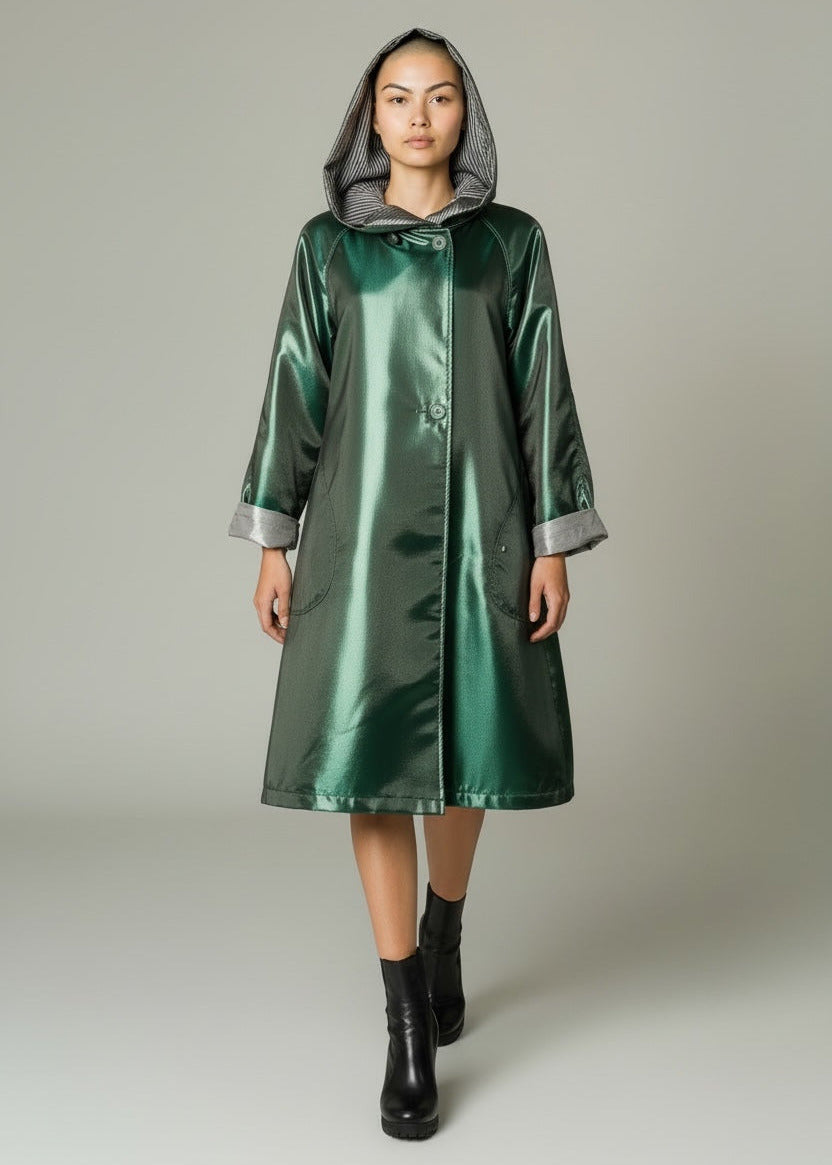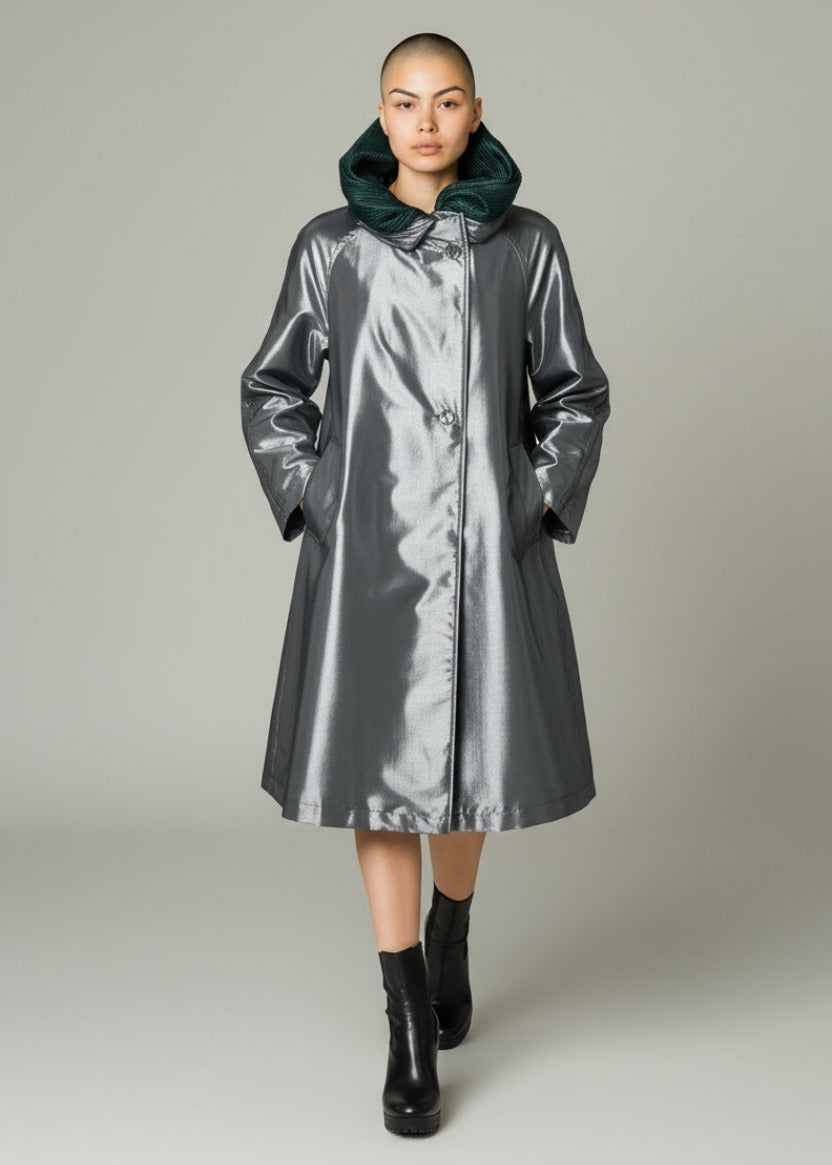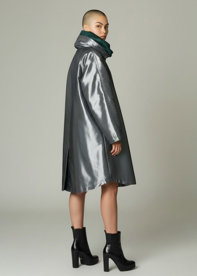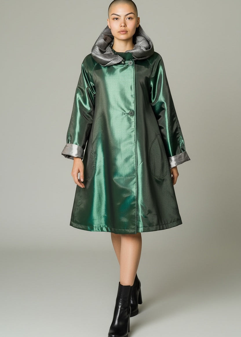Der elegante Wendemantel von ALQUEMA besticht durch seine Vielseitigkeit: Wechseln Sie mühelos zwischen glänzendem Grün und Anthrazit-Silber je nach Anlass und Stimmung. Der großzügige Kragen lässt sich optional als Kapuze tragen und verleiht Ihrem Look Flexibilität. Praktische Seitentaschen auf grüner Seite, klassischer Knopfverschluss. Ungefüttert und leicht geschnitten, ist dieser Mantel die ideale Wahl für einen raffinierten, glamourösen Auftritt.