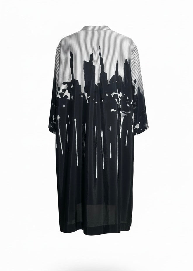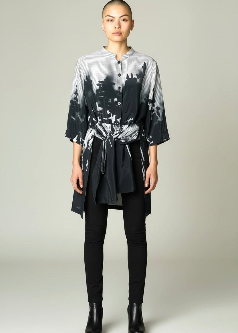 Die KAMUFLAGE Tunika besticht durch ihre lockere Passform und das durchdachte Allover-Print-Design in Schwarz mit Weiß- und Grautönen. Das luftige Material sorgt für optimalen Tragekomfort an warmen Tagen, während die weite Schnittführung (leichte A-Linie) maximale Bewegungsfreiheit bietet, mit hohen Seitenschlitzen, um die Vorderseite auch binden zu können (siehe Fotos), ohne Seitentaschen. Die Tunika hat 3/4 Ärmelänge. Das moderne Muster verleiht jedem Outfit eine urbane Note – perfekt für einen entspannten, zeitgemäßen Look mit hohem Tragekomfort.